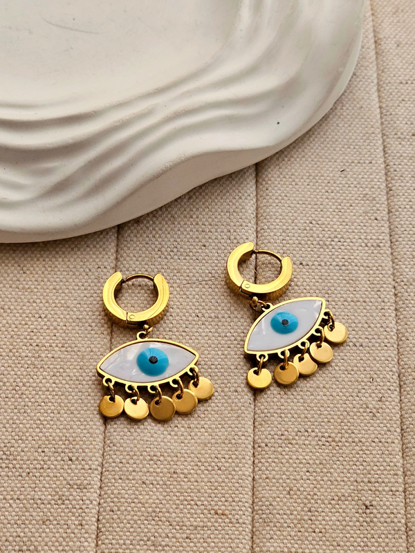 Gold Plated Evil Eye Drop Earrings with Dangling Discs